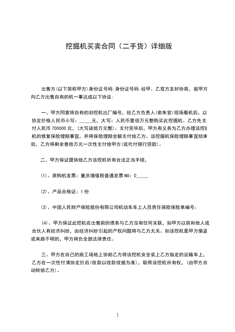 一、甲方同意将自有的旧挖机出厂编号,经乙方负责人(俞朱官)现场看机后,以协定价格人民币小写:_____元,大写:人民币壹佰万元整购买此挖掘机。乙方先支付人民币700000元,(大写柒拾万元整)。支付完毕后,甲方有义务为乙方办理该挖掘机的修复保险理赔事宜,并将保险理赔全额支付给乙方。该挖掘机保险理赔事宜结束后,乙方将剩余叁拾万元一次性支付给甲方(或代付银行贷款)。