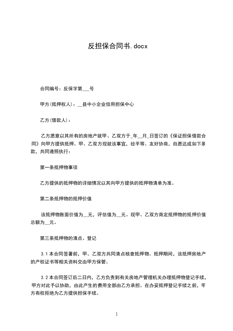 鉴于乙方同意为借款人与贷款人__开发区农村信用合作联社营业部签订的借款额为__万元整的《借款合同》(合同编号:)提供保证担保,甲方愿向乙方提供财产抵押和连带责任保证,作为乙方承担保证责任的反担保。现双方根据《中华人民共和国民法典》等有关法律规定,协商一致,达成如下协议,并承诺共同遵守执行。