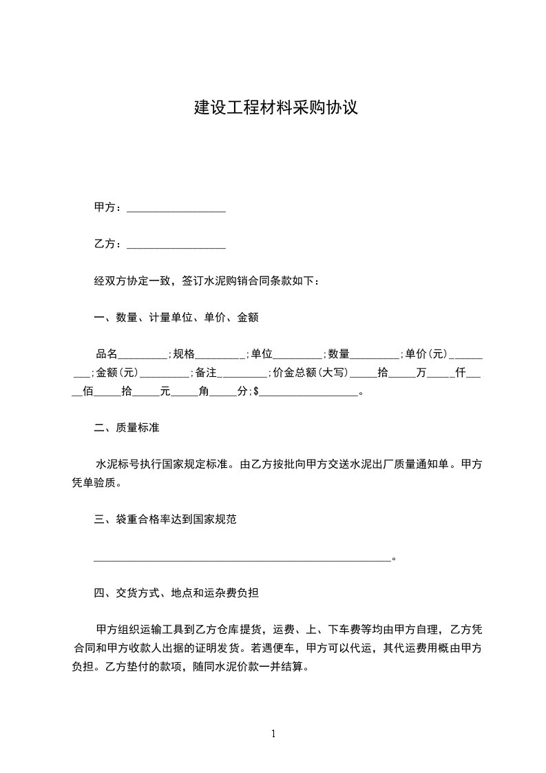 经双方协定一致,签订水泥购销合同条款如下: