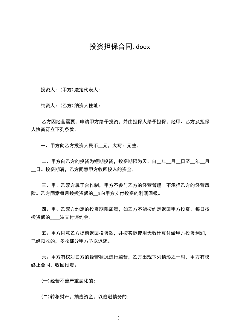 乙方因经营需要,申请甲方给予投资,并由担保人给予担保,经甲、乙方及担保人协商订立下列条款: