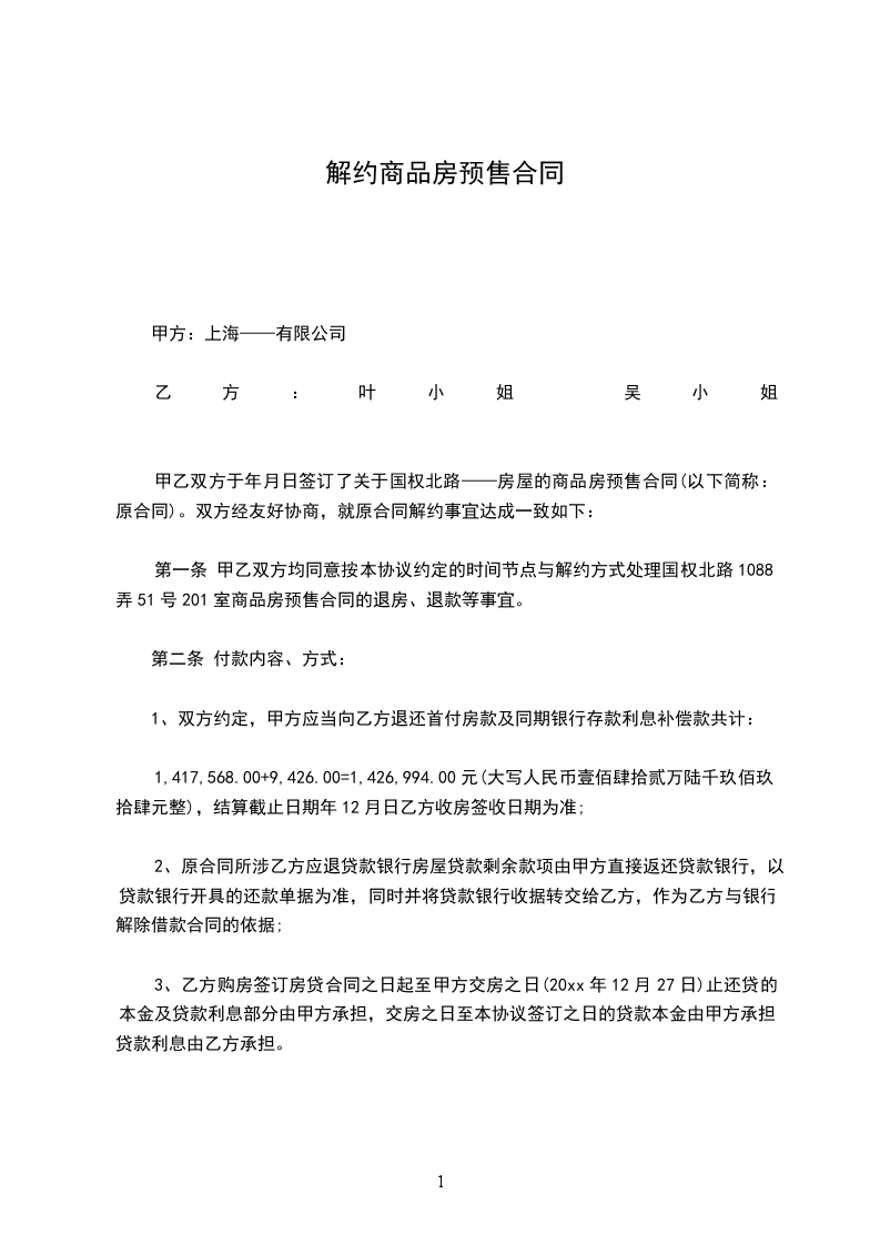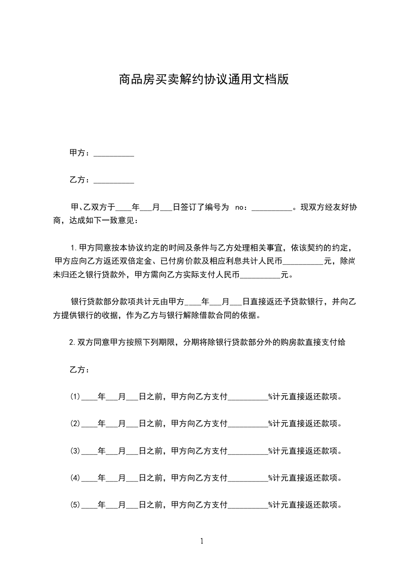 1.甲方同意按本协议约定的时间及条件与乙方处理相关事宜,依该契约的约定,甲方应向乙方返还双倍定金、已付房价款及相应利息共计人民币__________元,除尚未归还之银行贷款外,甲方需向乙方实际支付人民币__________元。