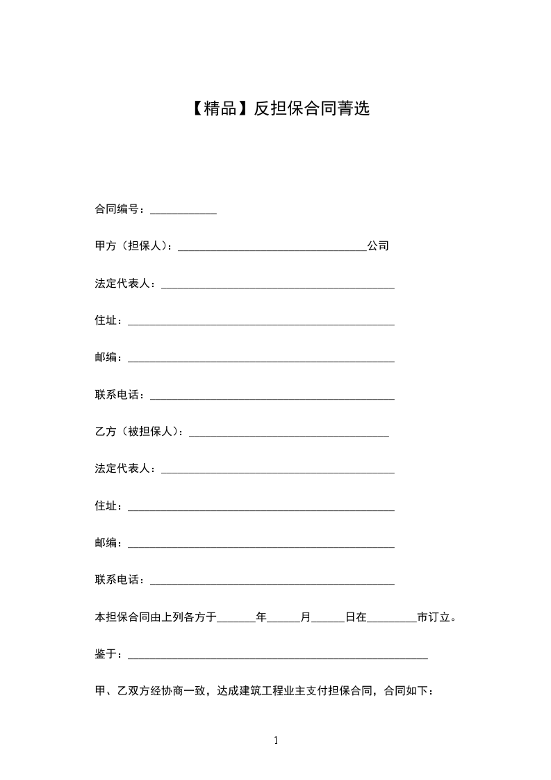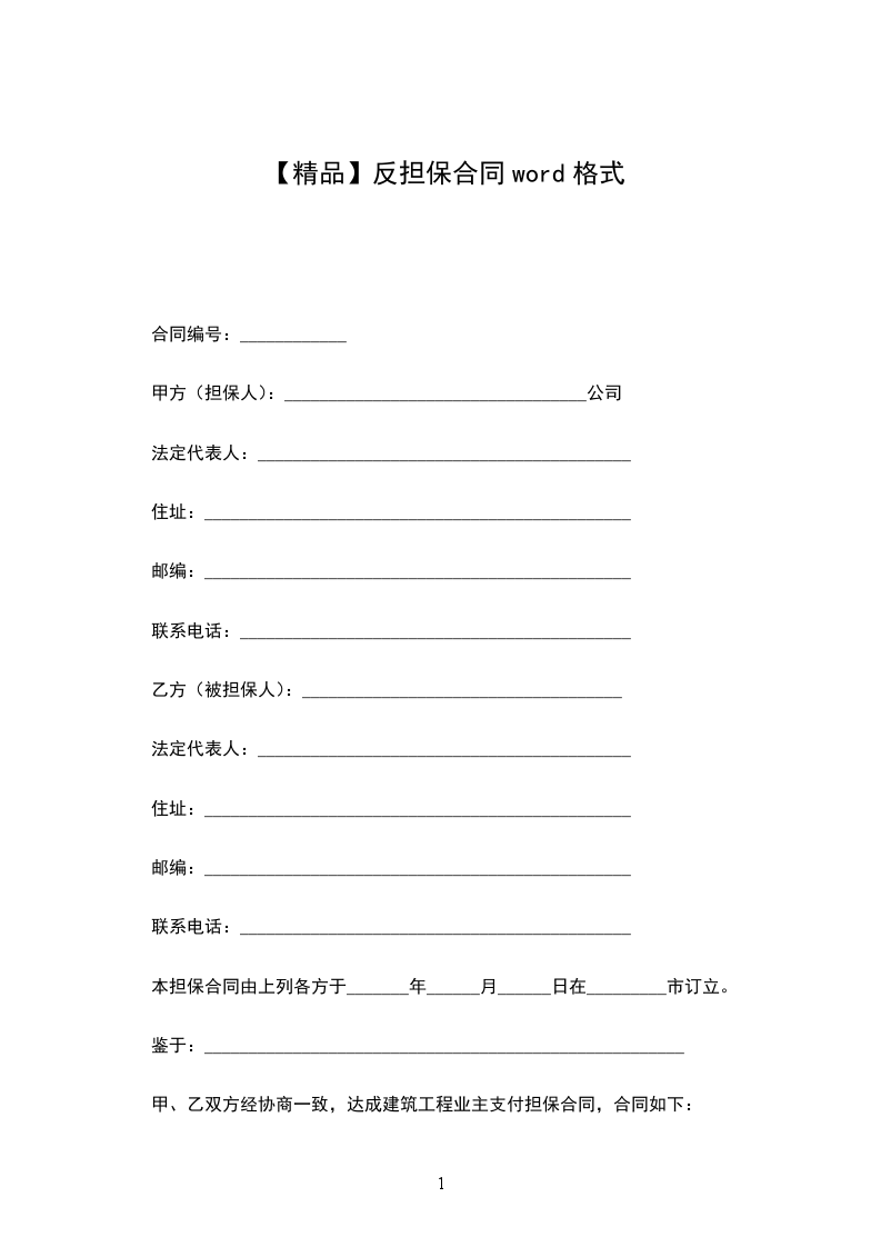 第一条为了确保乙方与_________(下称承包商)签署合同编号为_______年________字第_______号建筑合同项下乙方支付义务得到切实履行,甲方利用自身担保经营权愿意为乙方向业主提供保证责任。为了明确双方权利、义务,依据《中华人民共和国民法典》及其他有关法律法规规定,甲、乙双方经平等协商一致,订立本合同。
