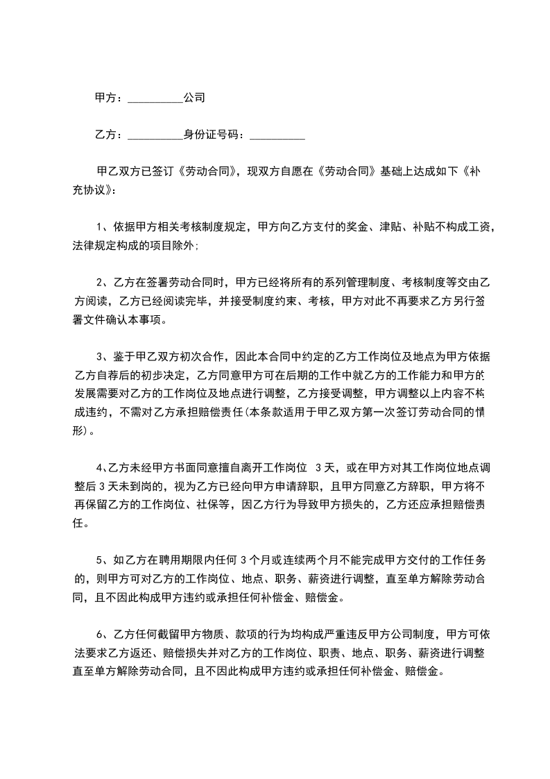 9、本补充协议为甲乙双方签订的劳动合同的有效补充,与劳动合同具有同等法律效力。