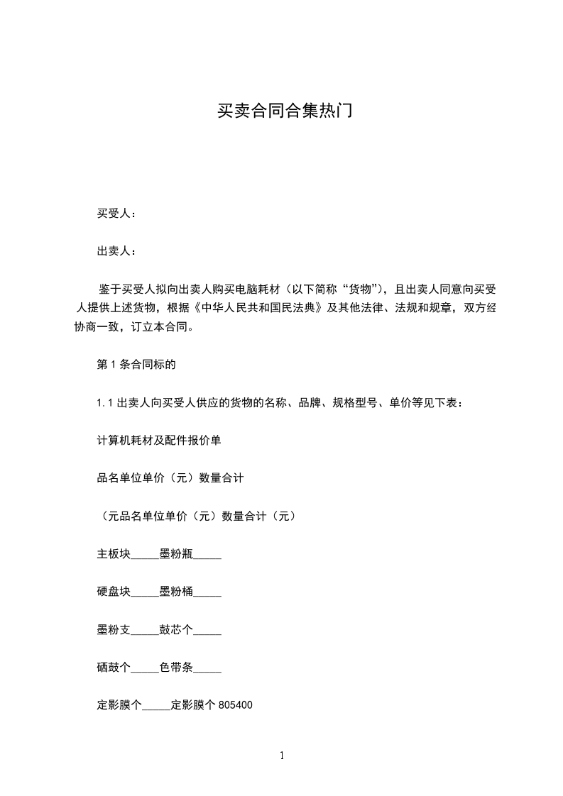 鉴于买受人拟向出卖人购买电脑耗材(以下简称“货物”),且出卖人同意向买受人提供上述货物,根据《中华人民共和国民法典》及其他法律、法规和规章,双方经协商一致,订立本合同。