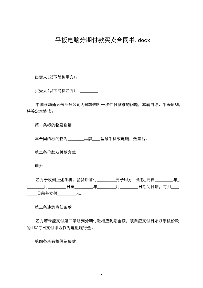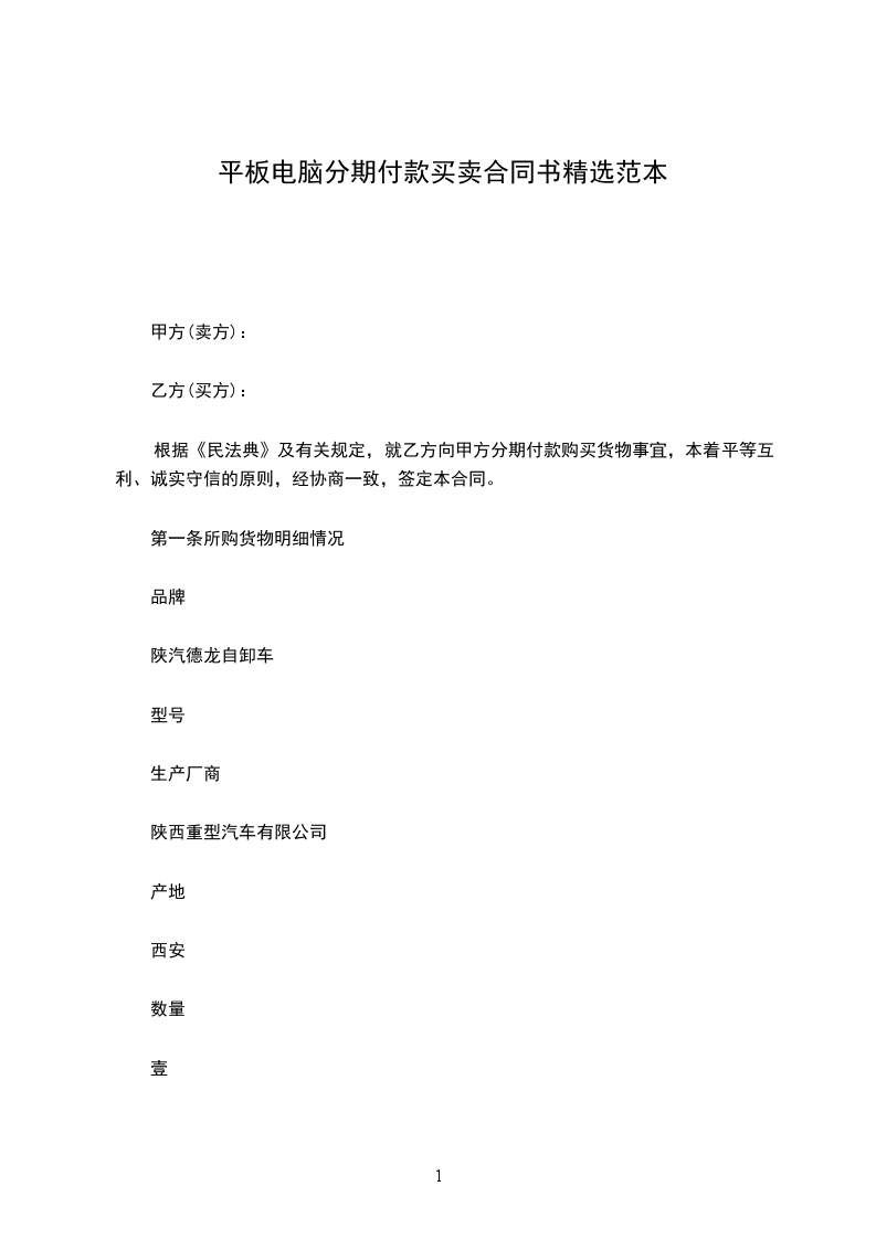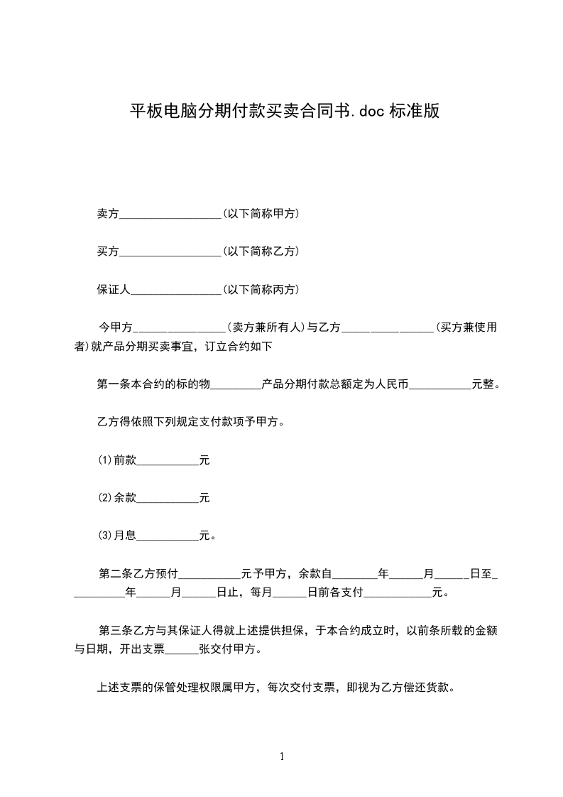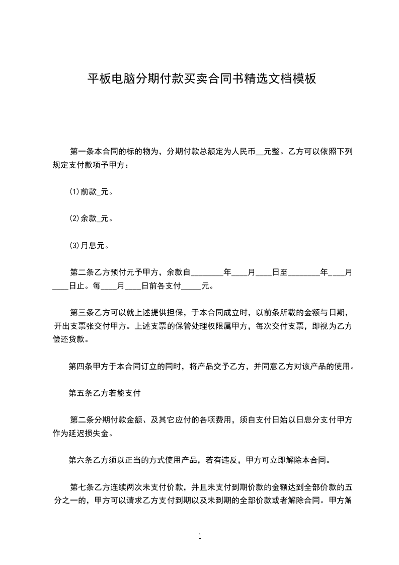 第一条本合同的标的物为_______,分期付款总额定为人民币_______元整。乙方可以依照下列规定支付款项予甲方: