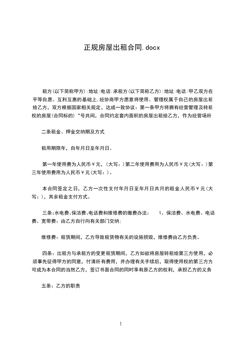 1.甲方将其合法拥有的座落在_________市_________区(县)_________路_________小区_________楼_________单元_________号出租给乙方使用。