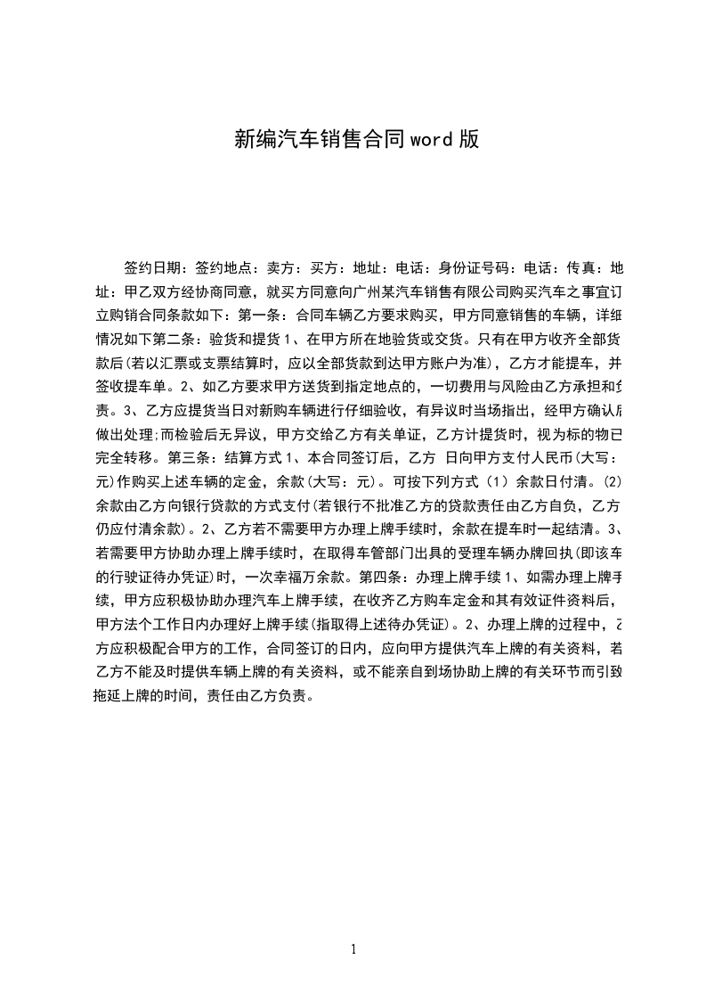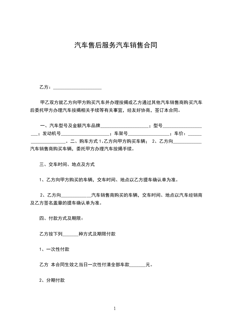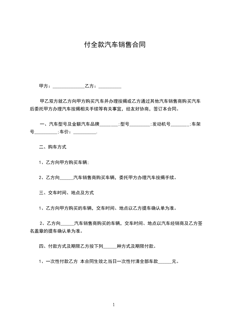 第三条:甲方的付款方式和期限:本合同生效当日付定金___________万元,___________日内再支付第一笔车款现金___________万元;其余部分车款在该车办理转户手续前全部付清。