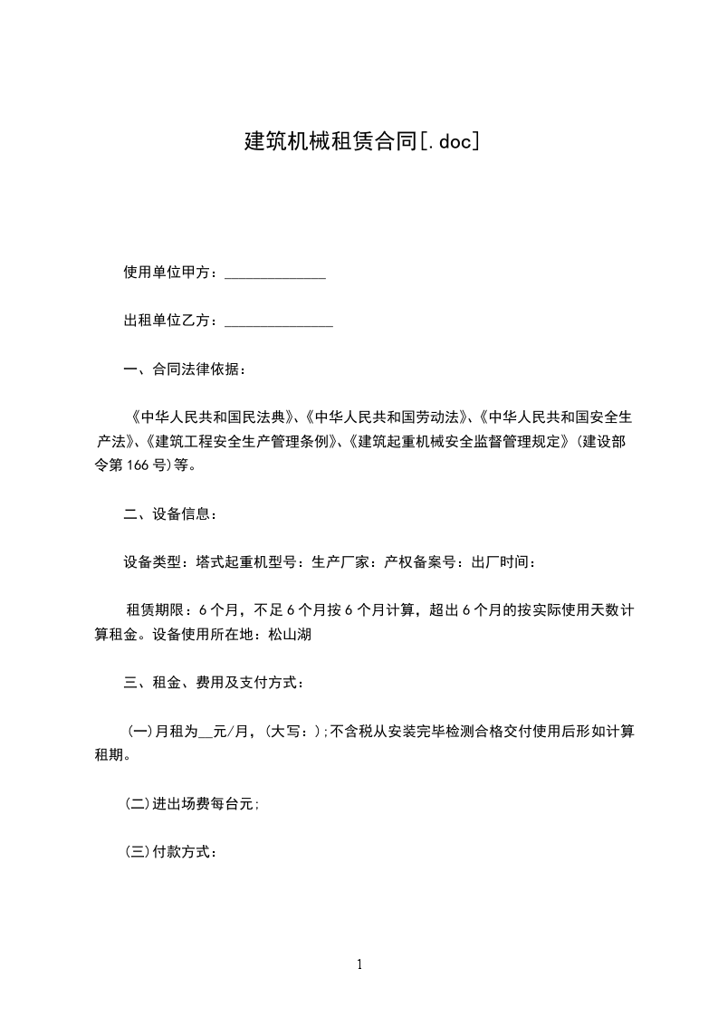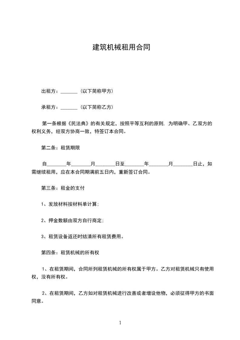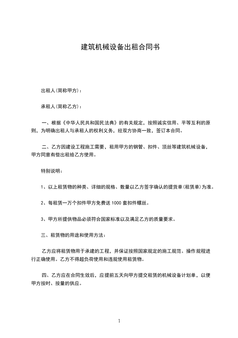 三、租赁期限__年__月__日起至__年__月___日止。如果租用时间不足按约定时间,延长按送货租用实际天数计算。租赁期限需在__个月以上,不足__个月,按__个月租赁收费,租赁物资退完前合同一直有效,租费持续计算。