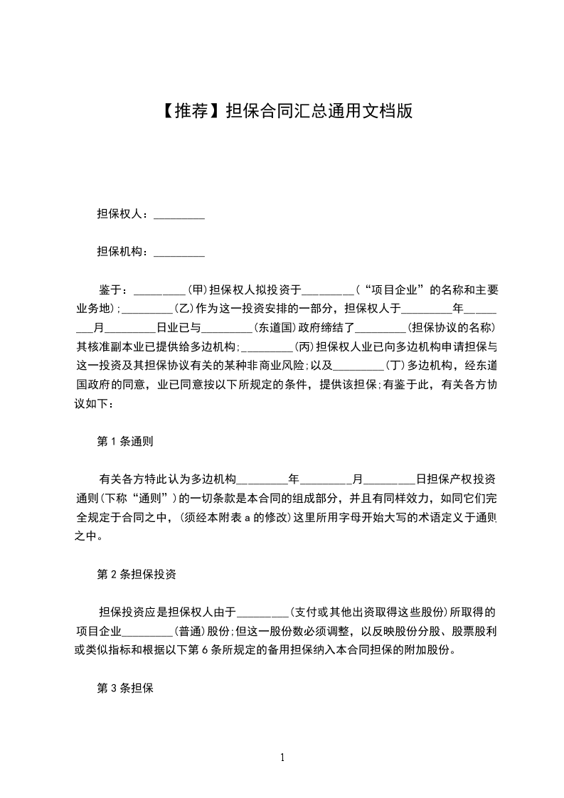 鉴于:_________(甲)担保权人拟投资于_________(“项目企业”的名称和主要业务地);_________(乙)作为这一投资安排的一部分,担保权人于_________年_________月_________日业已与_________(东道国)政府缔结了_________(担保协议的名称),其核准副本业已提供给多边机构;_________(丙)担保权人业已向多边机构申请担保与这一投资及其担保协议有关的某种非商业风险;以及_________(丁)多边机构,经东道国政府的同意,业已同意按以下所规定的条件,提供该担保;有鉴于此,有关各方协议如下: