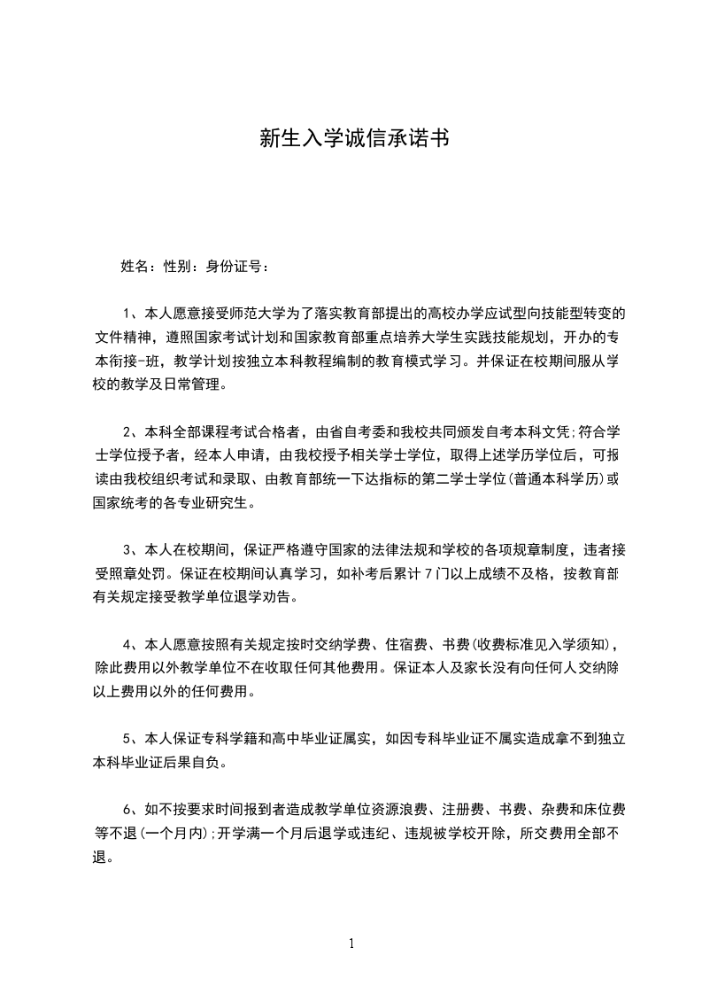 1、本人愿意接受师范大学为了落实教育部提出的高校办学应试型向技能型转变的文件精神,遵照国家考试计划和国家教育部重点培养大学生实践技能规划,开办的专本衔接-班,教学计划按独立本科教程编制的教育模式学习。并保证在校期间服从学校的教学及日常管理。