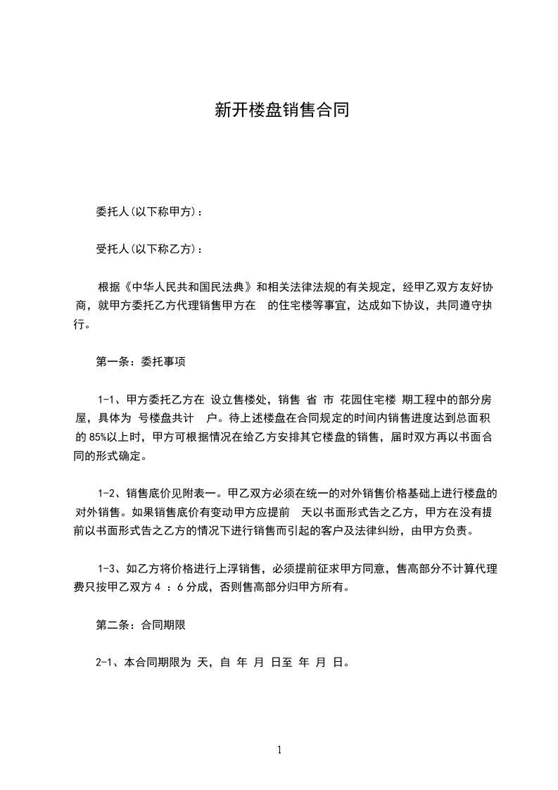 1-1、甲方委托乙方在 设立售楼处,销售 省 市 花园住宅楼 期工程中的部分房屋,具体为 号楼盘共计 户。待上述楼盘在合同规定的时间内销售进度达到总面积的85%以上时,甲方可根据情况在给乙方安排其它楼盘的销售,届时双方再以书面合同的形式确定。