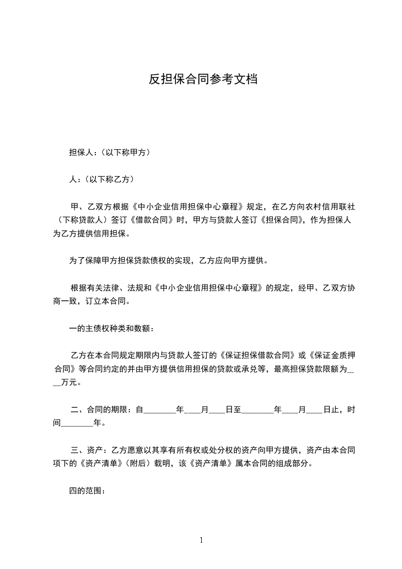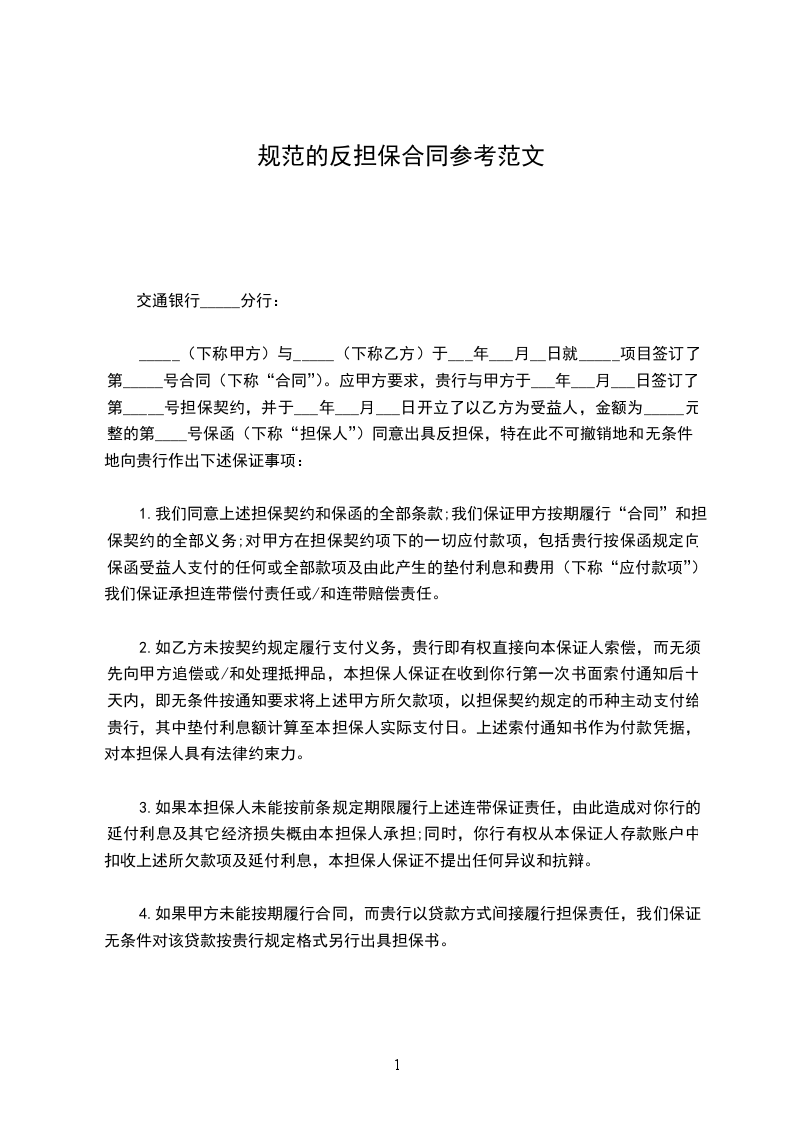 _____(下称甲方)与_____(下称乙方)于___年___月__日就_____项目签订了第_____号合同(下称“合同”)。应甲方要求,贵行与甲方于___年___月___日签订了第_____号担保契约,并于___年___月___日开立了以乙方为受益人,金额为_____元整的第____号保函(下称“担保人”)同意出具反担保,特在此不可撤销地和无条件地向贵行作出下述保证事项:
