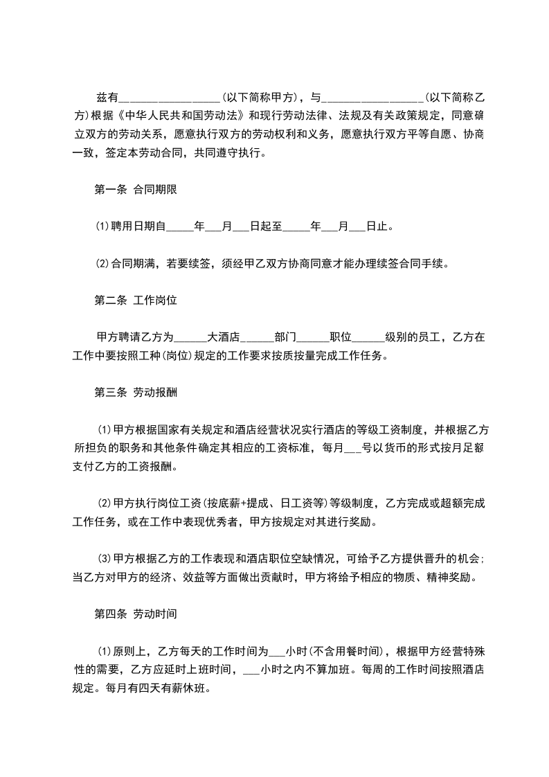 (1)甲方根据国家有关规定和酒店经营状况实行酒店的等级工资制度,并根据乙方所担负的职务和其他条件确定其相应的工资标准,每月___号以货币的形式按月足额支付乙方的工资报酬。