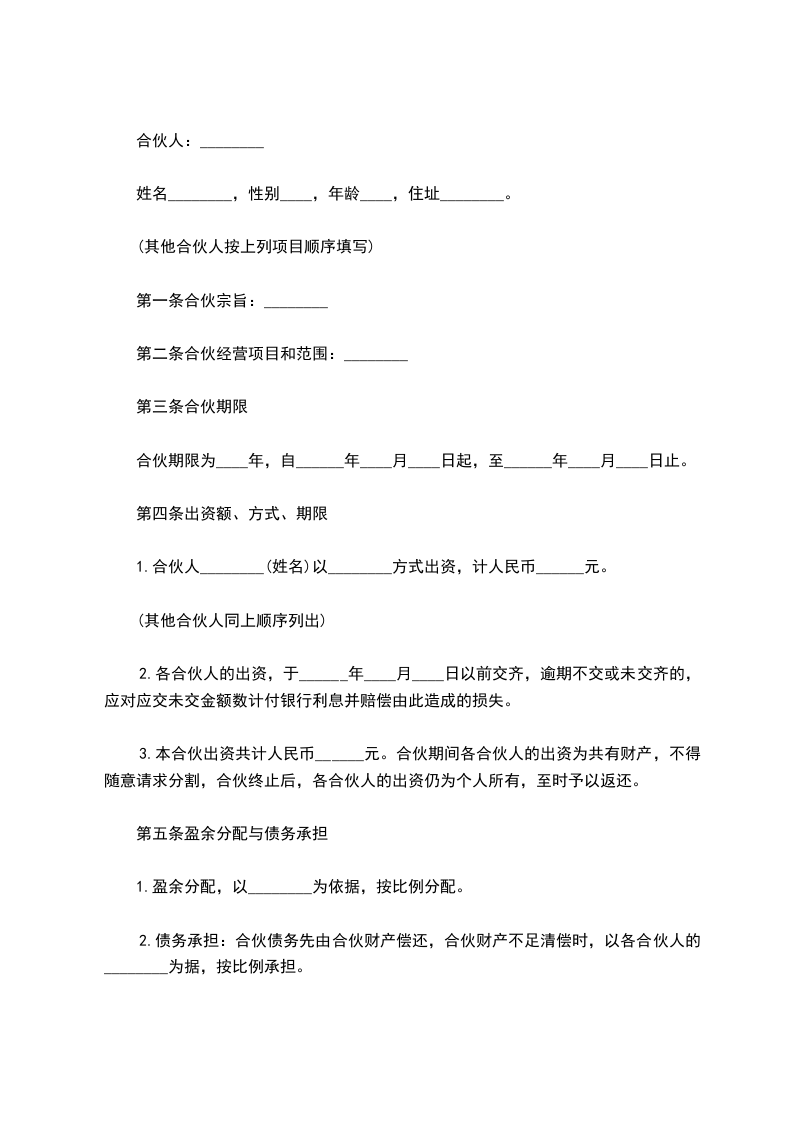 3.本合伙出资共计人民币______元。合伙期间各合伙人的出资为共有财产,不得随意请求分割,合伙终止后,各合伙人的出资仍为个人所有,至时予以返还。
