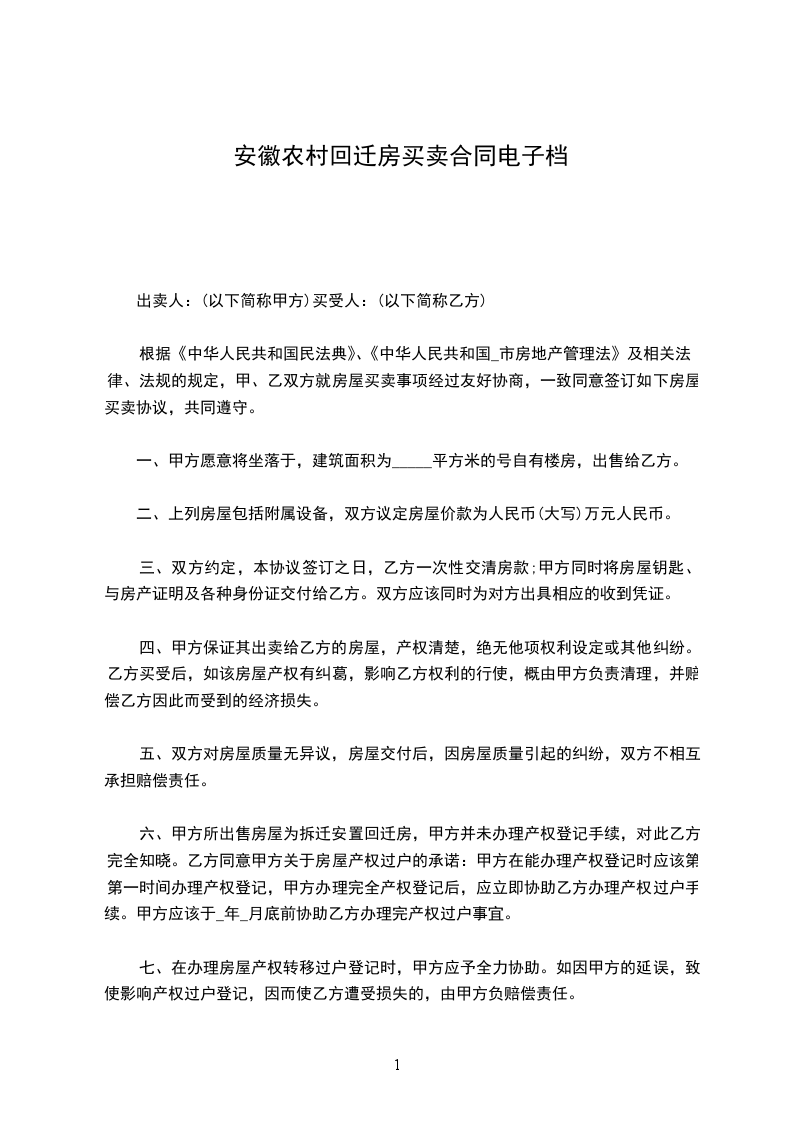 六、甲方所出售房屋为拆迁安置回迁房,甲方并未办理产权登记手续,对此乙方完全知晓。乙方同意甲方关于房屋产权过户的承诺:甲方在能办理产权登记时应该第第一时间办理产权登记,甲方办理完全产权登记后,应立即协助乙方办理产权过户手续。甲方应该于_年_月底前协助乙方办理完产权过户事宜。