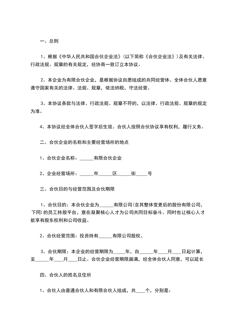 1、合伙目的:本合伙企业为______有限公司(含其整体变更后的股份有限公司,下同)的员工持股平台,意在凝聚核心人才为公司共同目标奋斗、同时也让核心人才能享有股东权利和公司收益。