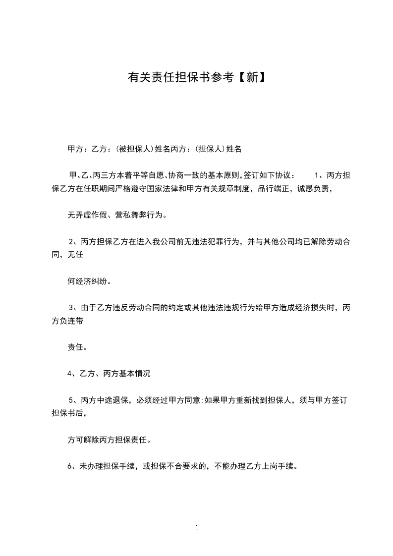 甲、乙、丙三方本着平等自愿、协商一致的基本原则,签订如下协议:1、丙方担保乙方在任职期间严格遵守国家法律和甲方有关规章制度,品行端正,诚恳负责,