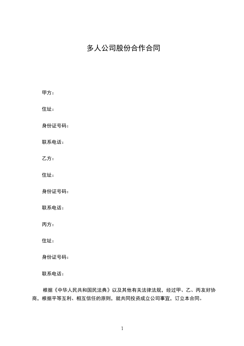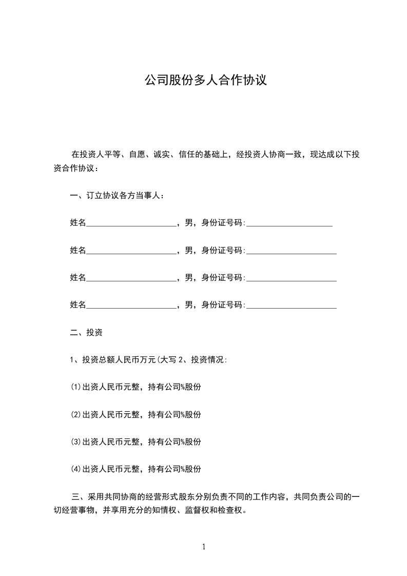 一、三方共同出资并在________工商局正式注册成立________公司(以下简称公司)。三方以现金或实物方式出资入股,公司股份分配如下:甲方占____%、乙方____%、丙方____%。公司收益按年核算分配。