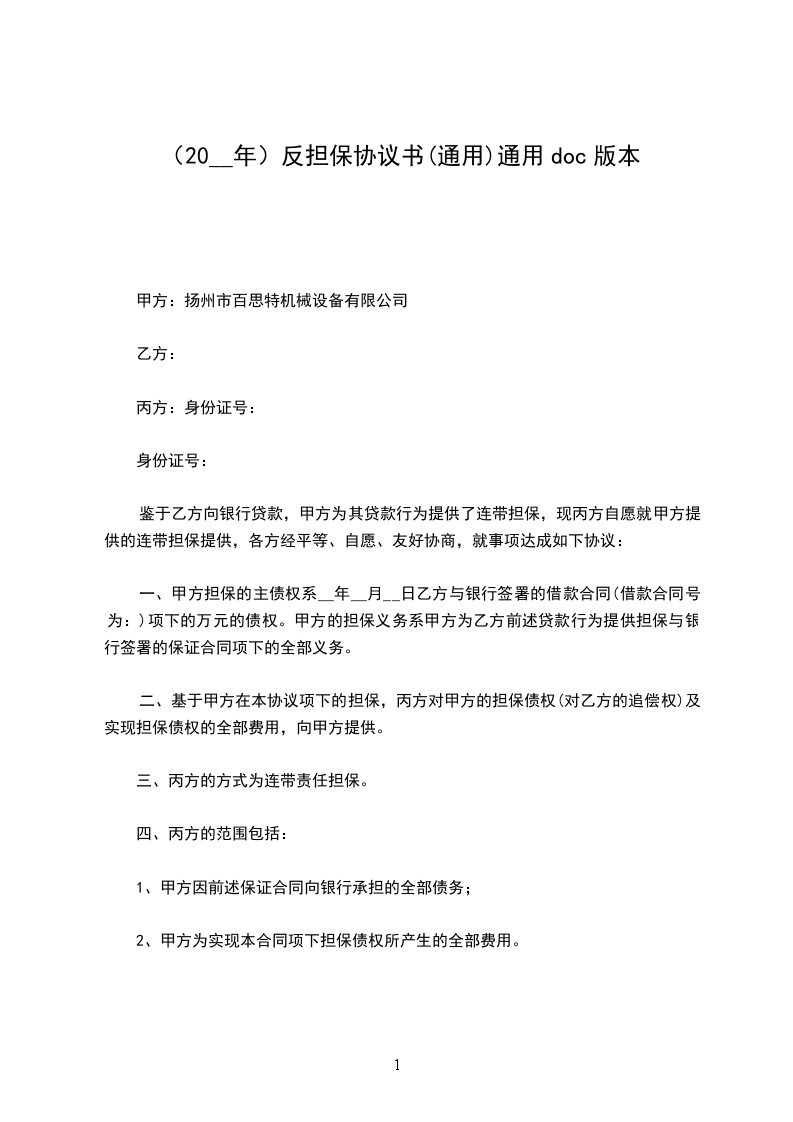 鉴于乙方向银行贷款,甲方为其贷款行为提供了连带担保,现丙方自愿就甲方提供的连带担保提供,各方经平等、自愿、友好协商,就事项达成如下协议: