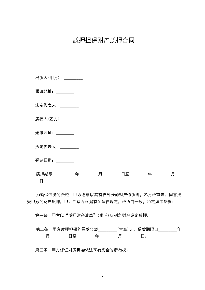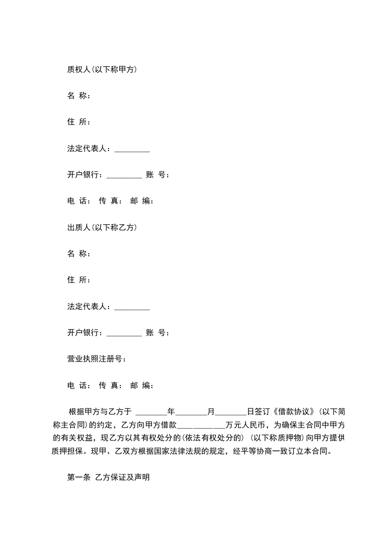1.出质人同意以自己所有或依法具有处分权的下列财产_______(详见动产质押清单)作质物,上述质押清单作为本合同组成部分,与本合同具有同等法律效力。
