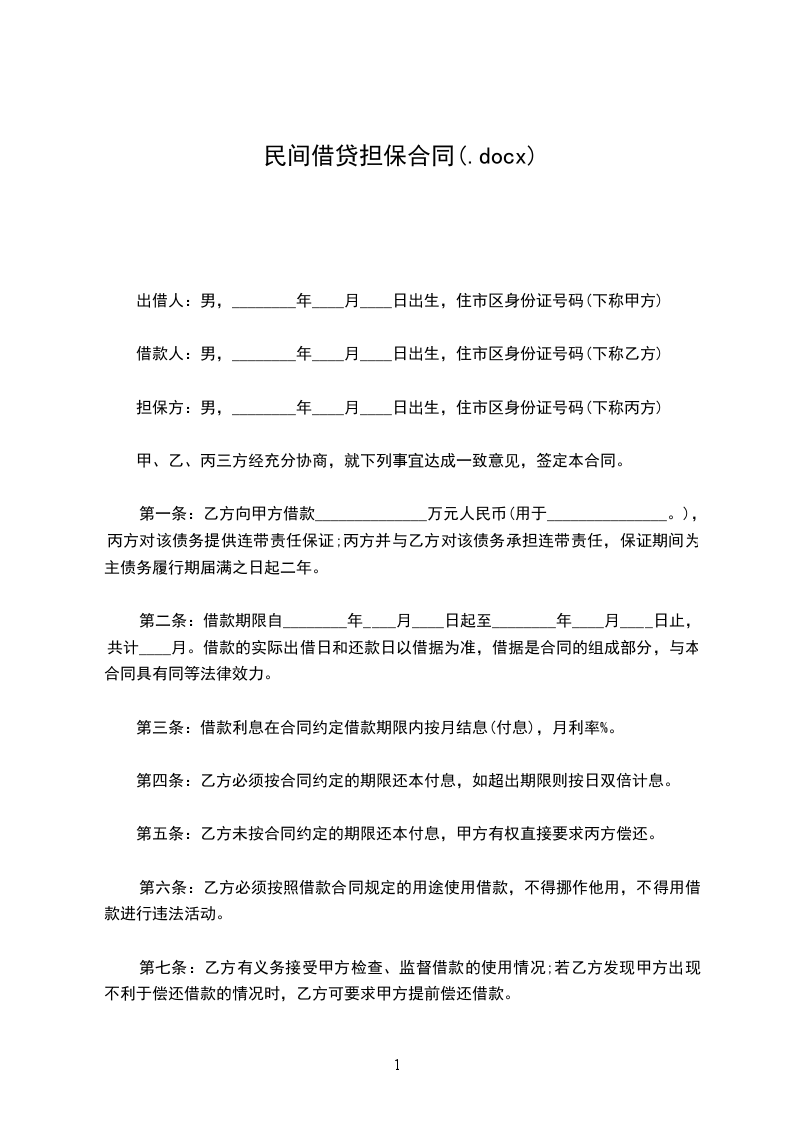 第一条:乙方向甲方借款______________万元人民币(用于_______________。),丙方对该债务提供连带责任保证;丙方并与乙方对该债务承担连带责任,保证期间为主债务履行期届满之日起二年。