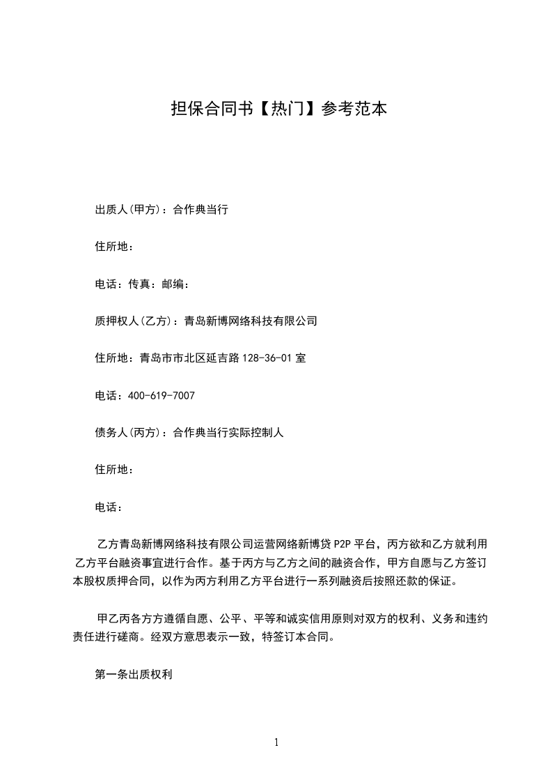 乙方青岛新博网络科技有限公司运营网络新博贷P2P平台,丙方欲和乙方就利用乙方平台融资事宜进行合作。基于丙方与乙方之间的融资合作,甲方自愿与乙方签订本股权质押合同,以作为丙方利用乙方平台进行一系列融资后按照还款的保证。