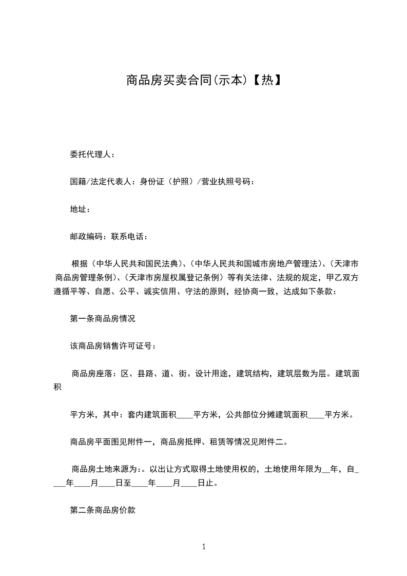 根据(中华人民共和国民法典)、(中华人民共和国城市房地产管理法)、(天津市商品房管理条例)、(天津市房屋权属登记条例)等有关法律、法规的规定,甲乙双方遵循平等、自愿、公平、诚实信用、守法的原则,经协商一致,达成如下条款: