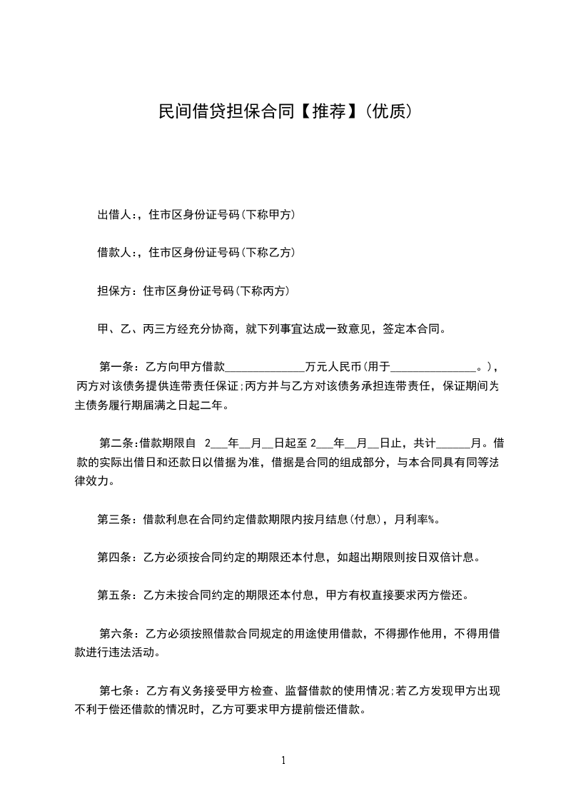 第一条为确保甲方与_________(以下简称借款人)签订的_________年_________字_________号借款合同(以下称借款合同)的履行,乙方愿意向甲方提供保证,甲、乙双方根据有关法律规定,协商订立本合同。