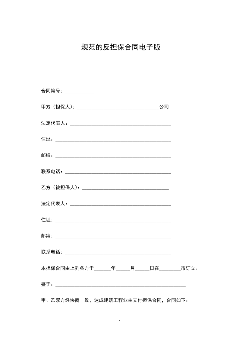 甲方(名称)与乙方(名称)于____年__月__日就____项目签订之____号合同(下称合同)。应甲方要求,贵行与甲方于____年__月__日签订了第____号担保契约,并于____年__月__日开立了以乙方为受益人,金额为____万____的第____号保函(上述担保契约和保函以下称担保)。应甲方要求,对上述担保,我们____公司(下称担保人)同意出具反担保,特在此不可撤销地和无条件地向贵行作出下述保证事项: