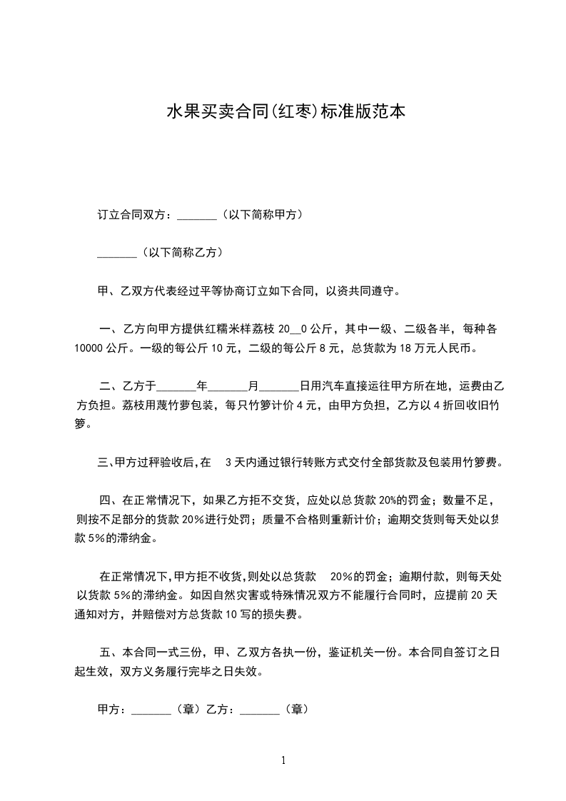 一、乙方向甲方提供红糯米样荔枝20__0公斤,其中一级、二级各半,每种各10000公斤。一级的每公斤10元,二级的每公斤8元,总货款为18万元人民币。