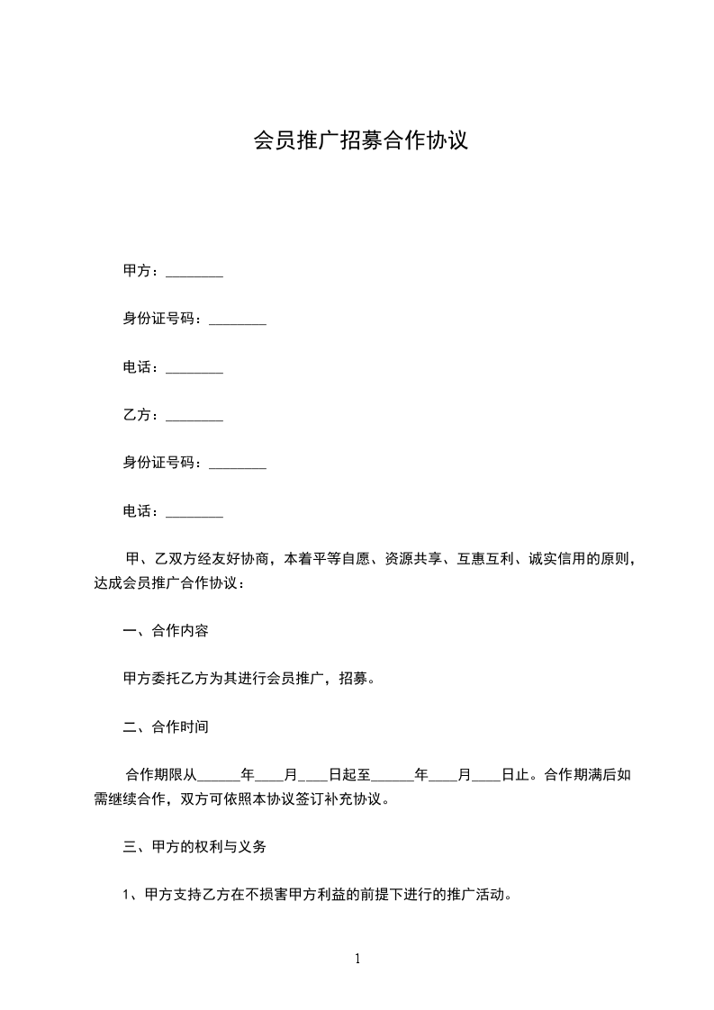 甲、乙双方经友好协商,本着平等自愿、资源共享、互惠互利、诚实信用的原则,达成会员推广合作协议: