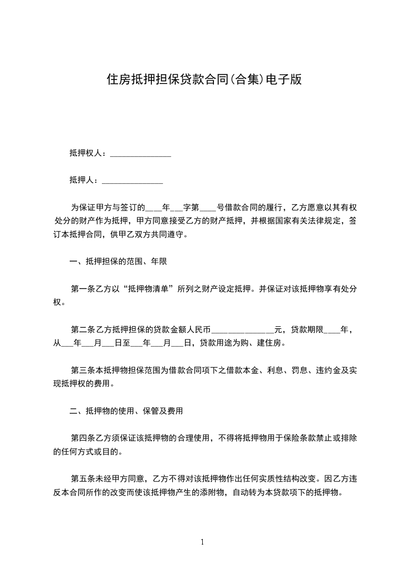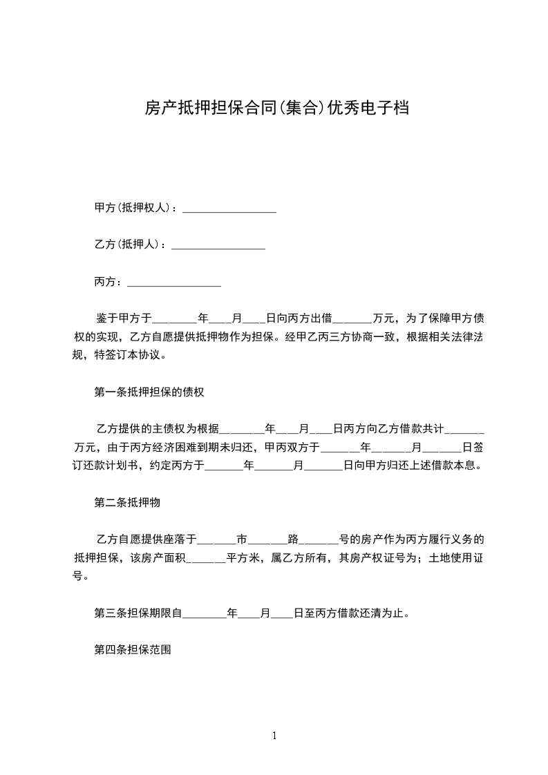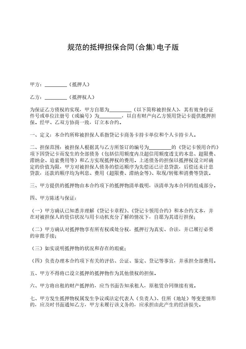 为保证乙方债权的实现,甲方自愿为_________(以下简称被担保人),其有效身份证件号或单位注册号(或编号)为_________,以自有财产向乙方领用贷记卡提供抵押担保。经甲、乙双方协商一致,订立本合约。