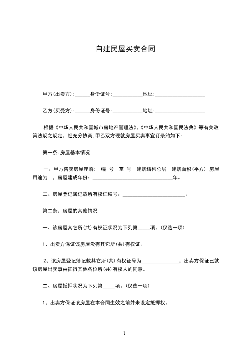 一、为房屋买卖有关事宜,经双方协商,订合同如下:甲方自愿下列房屋卖给乙方所有:
