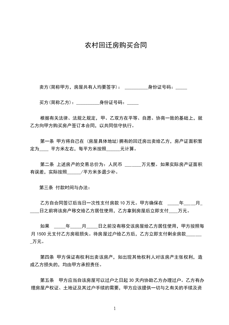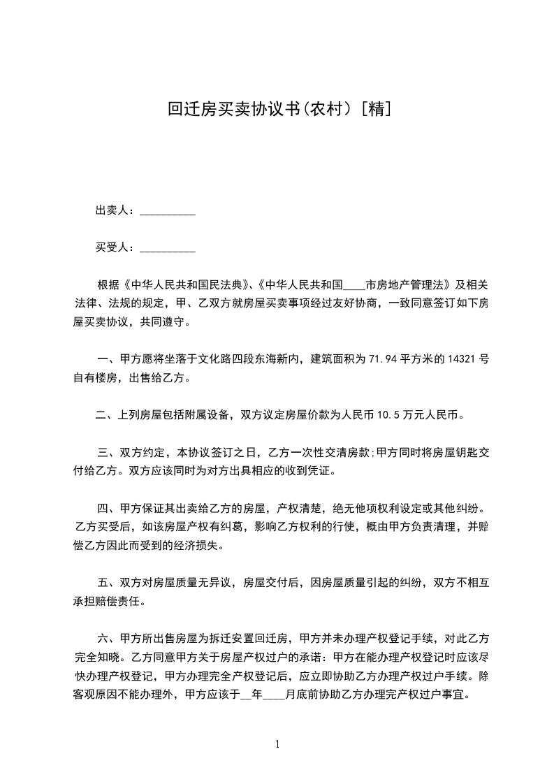 六、甲方所出售房屋为拆迁安置回迁房,甲方并未办理产权登记手续,对此乙方完全知晓。乙方同意甲方关于房屋产权过户的承诺:甲方在能办理产权登记时应该尽快办理产权登记,甲方办理完全产权登记后,应立即协助乙方办理产权过户手续。除客观原因不能办理外,甲方应该于__年____月底前协助乙方办理完产权过户事宜。