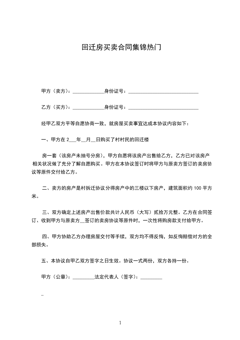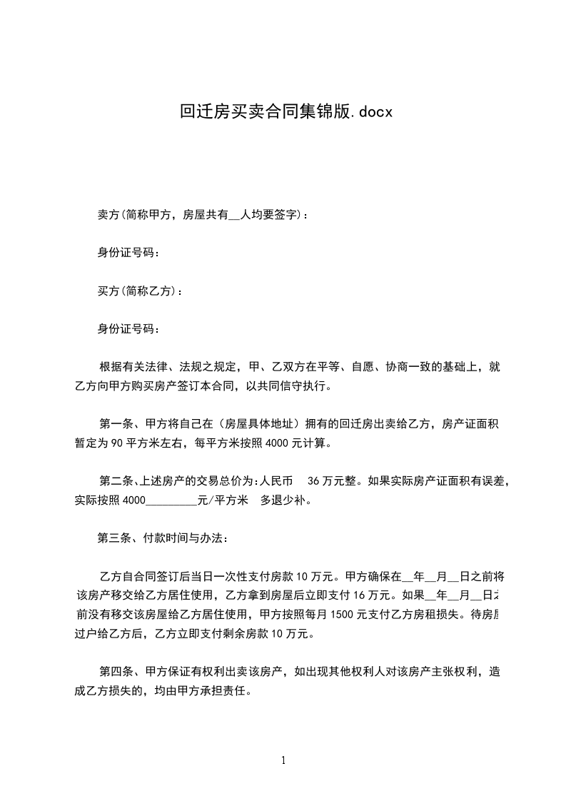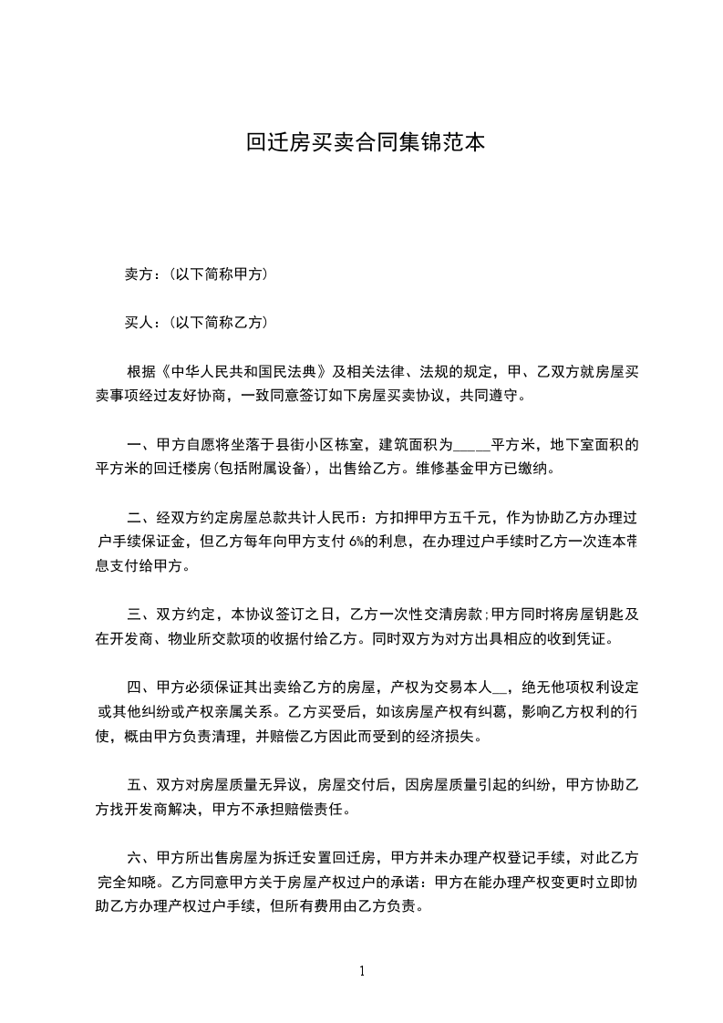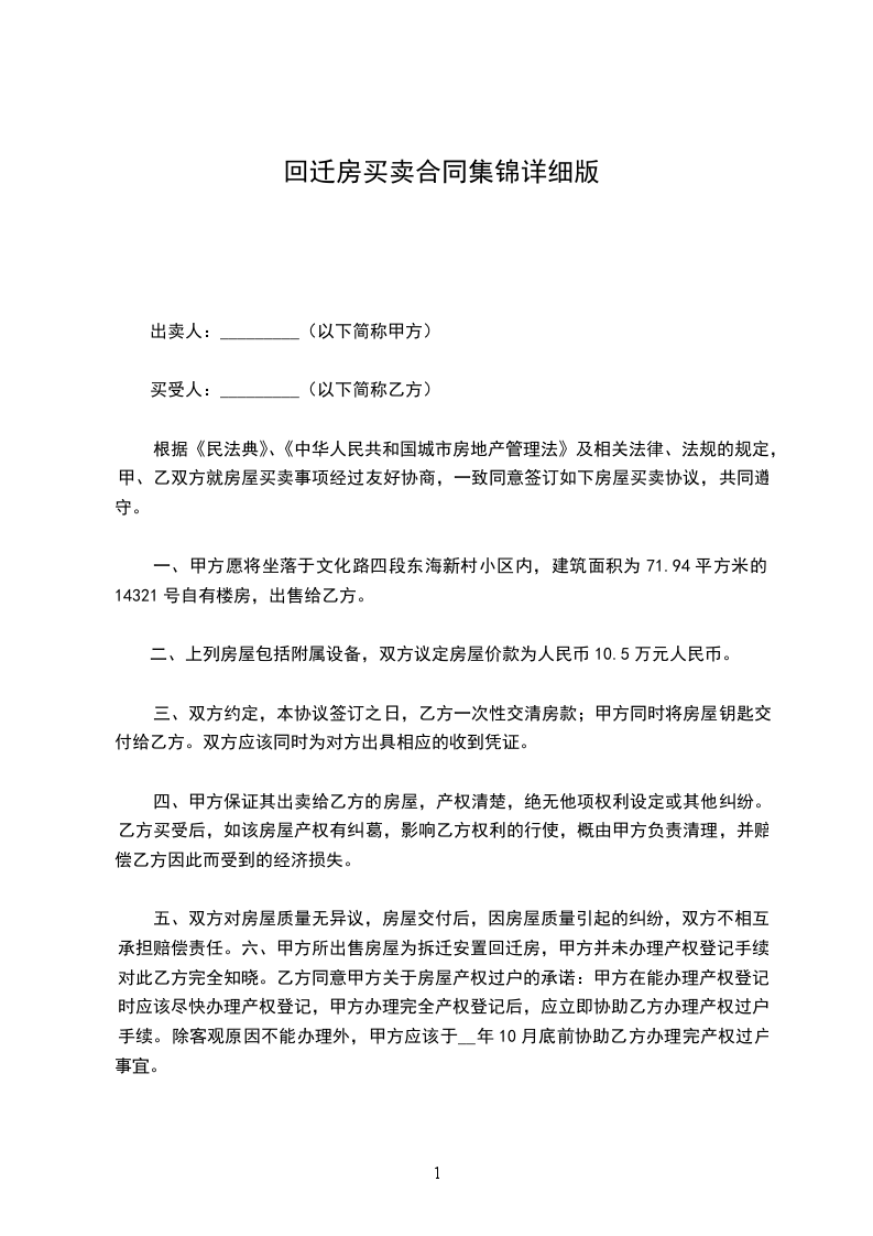 五、双方对房屋质量无异议,房屋交付后,因房屋质量引起的纠纷,双方不相互承担赔偿责任。六、甲方所出售房屋为拆迁安置回迁房,甲方并未办理产权登记手续,对此乙方完全知晓。乙方同意甲方关于房屋产权过户的承诺:甲方在能办理产权登记时应该尽快办理产权登记,甲方办理完全产权登记后,应立即协助乙方办理产权过户手续。除客观原因不能办理外,甲方应该于__年10月底前协助乙方办理完产权过户事宜。