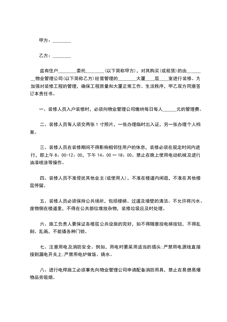 兹有住户________委托________(以下简称甲方),对其购买(或租赁)的由________物业管理公司(以下简称乙方)经营管理的________大厦____层____室进行装修。为加强对装修工程的管理,确保工程质量和大厦正常工作、生活秩序,甲乙双方同意签订本责任书。