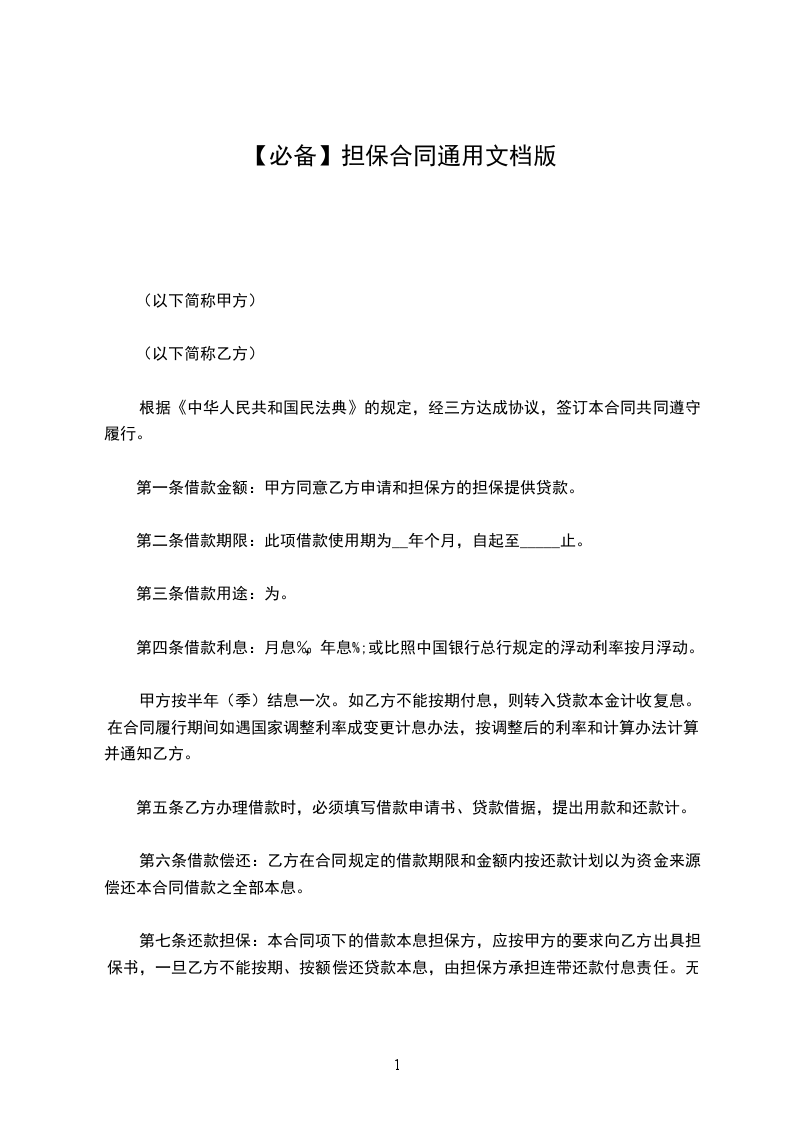 乙方(担保方)法定代表人:住所:邮政编码:电话:传真: