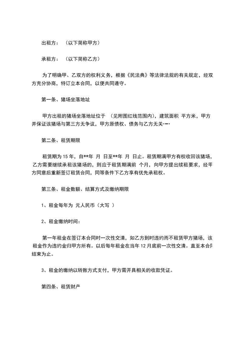租赁期为15年,自**年 月 日至**年 月 日止。租赁期满甲方有权收回该猪场,乙方需要继续承租该猪场的,则应于租赁期满前 个月,向甲方提出续租要求,经甲方同意后重新签订租赁合同,同等条件下乙方享有优先承租权。