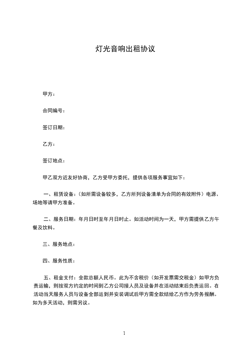 五、租金支付:全款总额人民币。此为不含税价(如开发票需交税金)如甲方负责运输,则按双方约定的时间到乙方公司接人员及设备并在活动结束后负责运回。在活动当天服务人员与设备全部运到并安装调试后甲方需全款结给乙方作为劳务报酬。如为多天活动,则需另议。