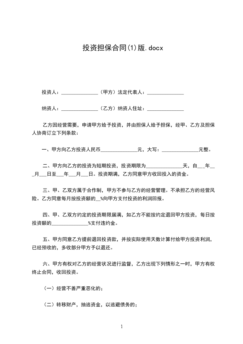 乙方因经营需要,申请甲方给予投资,并由担保人给予担保,经甲、乙方及担保人协商订立下列条款: