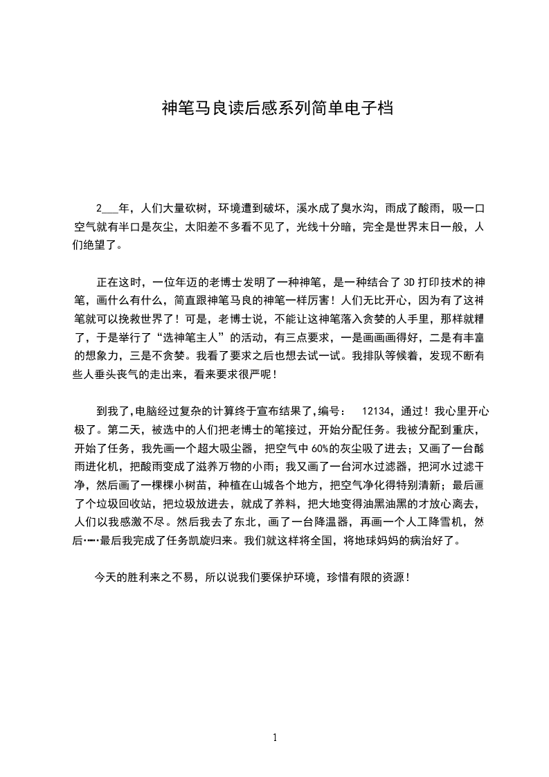 到我了,电脑经过复杂的计算终于宣布结果了,编号:12134,通过!我心里开心极了。第二天,被选中的人们把老博士的笔接过,开始分配任务。我被分配到重庆,开始了任务,我先画一个超大吸尘器,把空气中60%的灰尘吸了进去;又画了一台酸雨进化机,把酸雨变成了滋养万物的小雨;我又画了一台河水过滤器,把河水过滤干净,然后画了一棵棵小树苗,种植在山城各个地方,把空气净化得特别清新;最后画了个垃圾回收站,把垃圾放进去,就成了养料,把大地变得油黑油黑的才放心离去,人们以我感激不尽。然后我去了东北,画了一台降温器,再画一个人工降雪机,然后……最后我完成了任务凯旋归来。我们就这样将全国,将地球妈妈的病治好了。