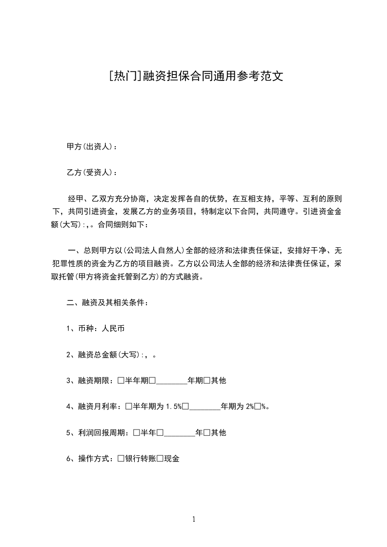一、总则甲方以(公司法人自然人)全部的经济和法律责任保证,安排好干净、无犯罪性质的资金为乙方的项目融资。乙方以公司法人全部的经济和法律责任保证,采取托管(甲方将资金托管到乙方)的方式融资。