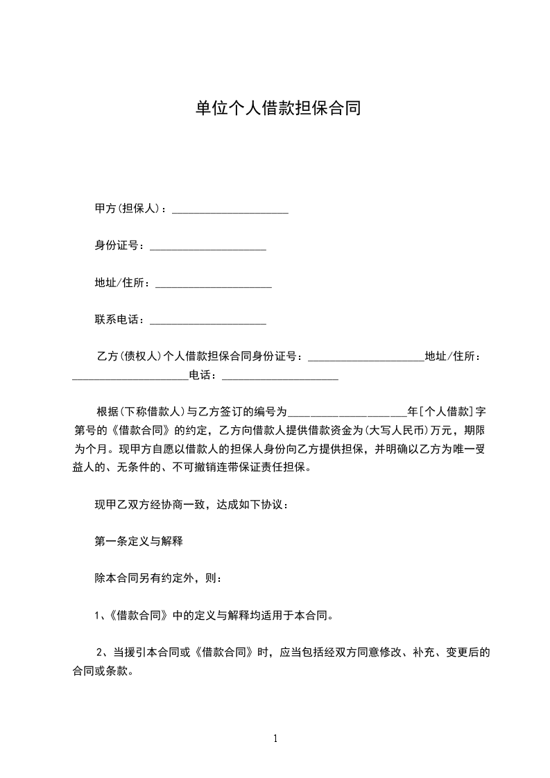 乙方(债权人)个人借款担保合同身份证号:_____________________地址/住所:_____________________电话:_____________________