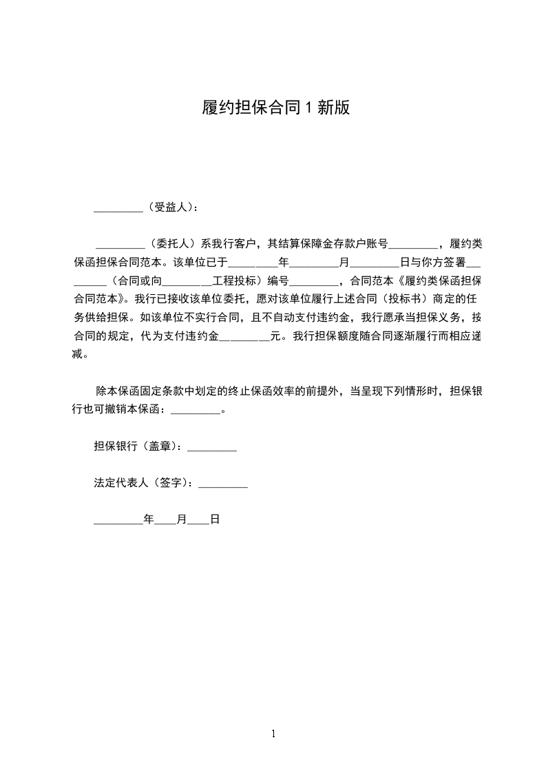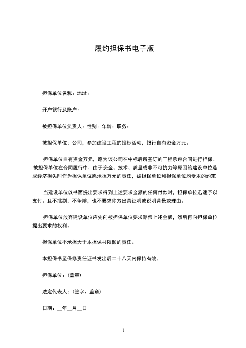 鉴于承包人已于_______年______月______日同雇主签署了_________(合同名称)的书面协议,下文中的合同包括合同中规定的文件、图纸、规范和修改;本担保书的条件是:如果承包人迅速地忠实地履行了上述合同,本担保书的责任失效;否则将保持有效。一旦雇主提出承包人违约,而雇主又履行了自己的责任,担保人将迅速弥补违约的损失,或者迅速: