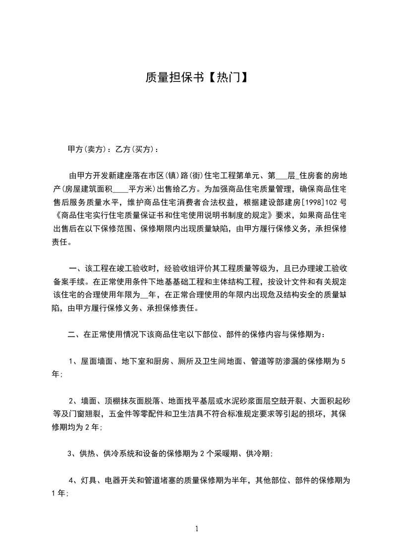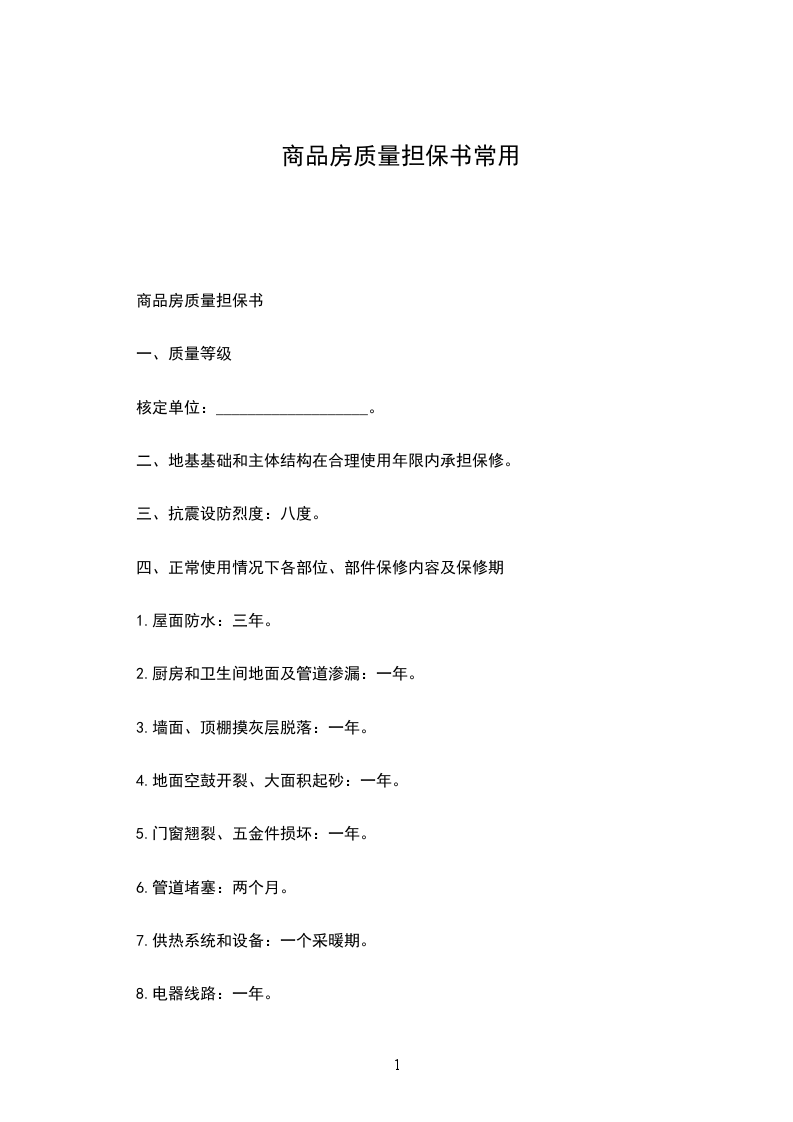 四、住户对商品房验收完毕,接收钥匙之日即为该商品房交付使用日期,也是本担保书签订日期,住宅保修自此日起计算。用户在使用过程中发现质量问题,可直接拨打我公司维修电话或认真填写附页中“商品住宅质量反馈表”寄予我公司。因住户使用不当或进行家庭装修以及不可抗拒的自然灾害而造成的质量问题,不在本公司保修范围之内。