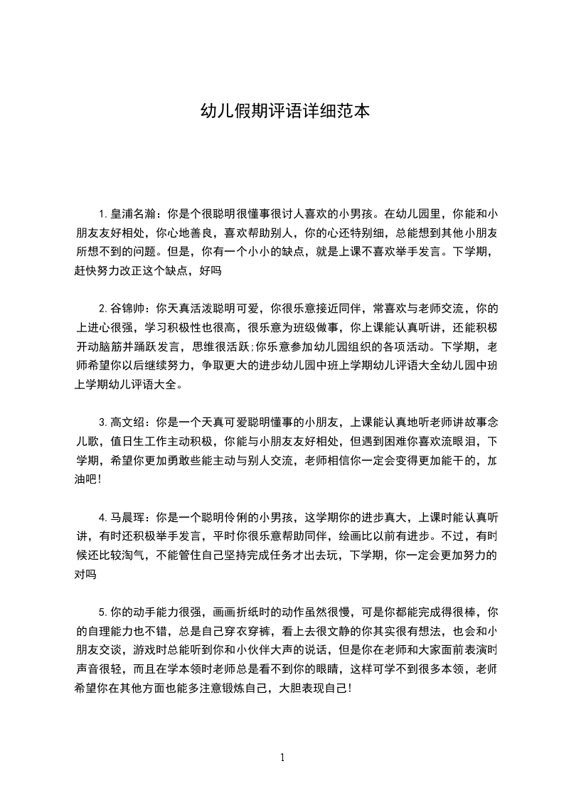 1.皇浦名瀚:你是个很聪明很懂事很讨人喜欢的小男孩。在幼儿园里,你能和小朋友友好相处,你心地善良,喜欢帮助别人,你的心还特别细,总能想到其他小朋友所想不到的问题。但是,你有一个小小的缺点,就是上课不喜欢举手发言。下学期,赶快努力改正这个缺点,好吗