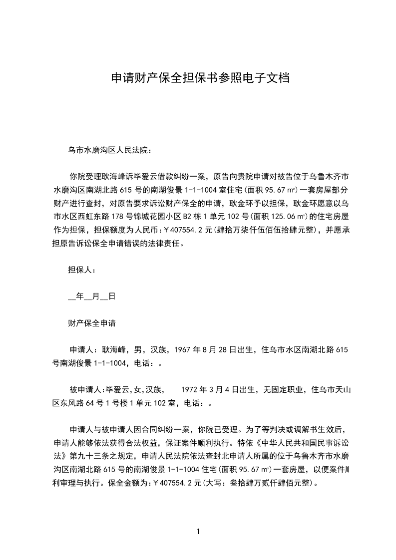 你院受理耿海峰诉毕爱云借款纠纷一案,原告向贵院申请对被告位于乌鲁木齐市水磨沟区南湖北路615号的南湖俊景1-1-1004室住宅(面积95.67㎡)一套房屋部分财产进行查封,对原告要求诉讼财产保全的申请,耿金环予以担保,耿金环愿意以乌市水区西虹东路178号锦城花园小区B2栋1单元102号(面积125.06㎡)的住宅房屋作为担保,担保额度为人民币:¥407554.2元(肆拾万柒仟伍佰伍拾肆元整),并愿承担原告诉讼保全申请错误的法律责任。