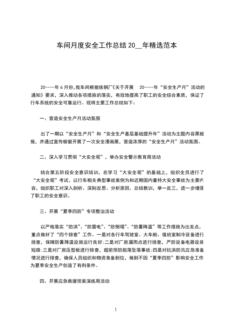 20----年6月份,我车间根据炼钢厂《关于开展20----年“安全生产月”活动的通知》要求,深入推动各项措施的落实,有效地提高了职工的安全综合素质,保证了行车系统的安全可靠运行。现将主要工作总结如下: