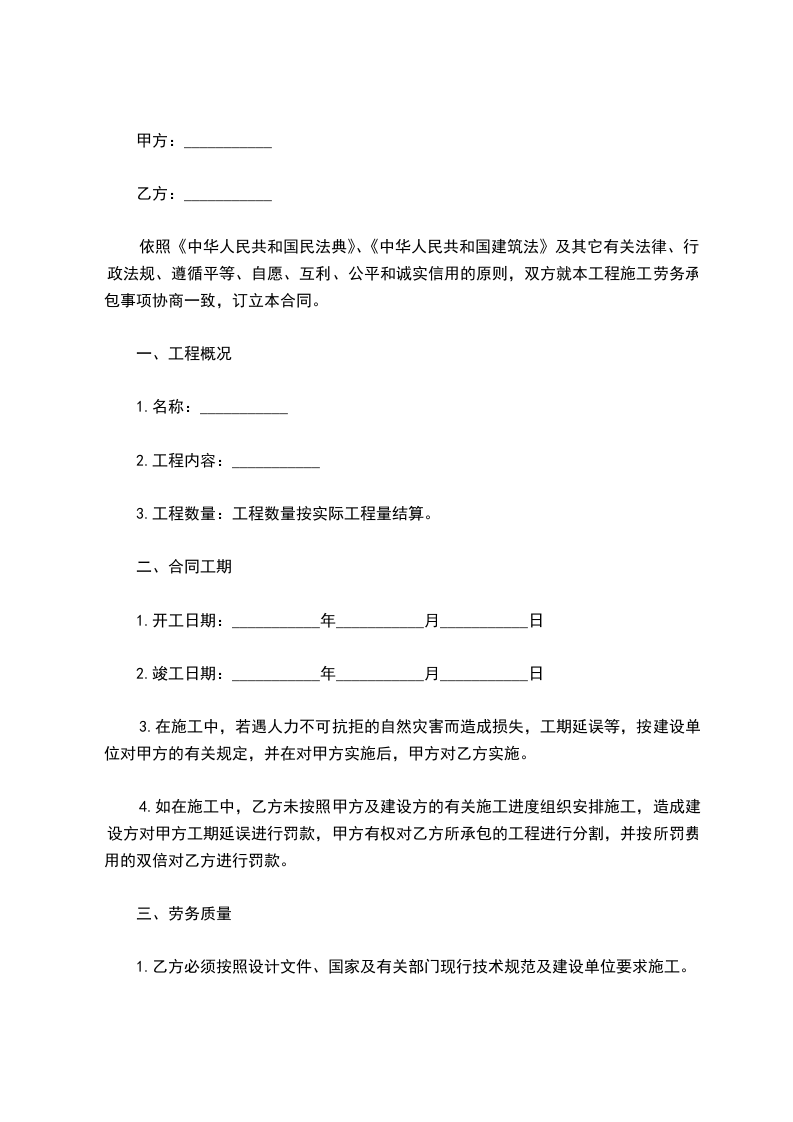 依照《中华人民共和国民法典》、《中华人民共和国建筑法》及其它有关法律、行政法规、遵循平等、自愿、互利、公平和诚实信用的原则,双方就本工程施工劳务承包事项协商一致,订立本合同。