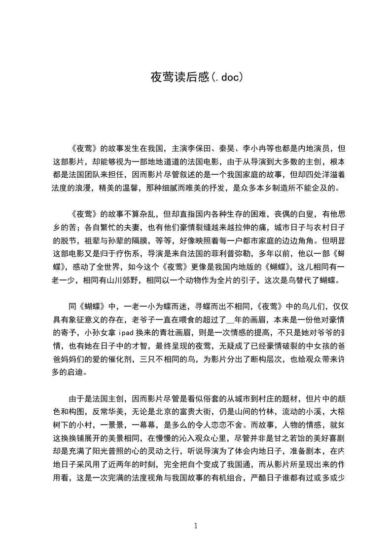 同《蝴蝶》中,一老一小为蝶而迷,寻蝶而出不相同,《夜莺》中的鸟儿们,仅仅具有象征意义的存在,老爷子一直在喂食的超过了__年的画眉,本来是一份他对豪情的寄予,小孙女拿ipad换来的青壮画眉,则是一次情感的提高,不只是她对爷爷的豪情,也有她在日子中的才智,最终呈现的夜莺,无疑成了已经豪情破裂的中女孩的爸爸妈妈们的爱的催化剂,三只不相同的鸟,为影片分出了断构层次,也给观众带来许多的启迪。